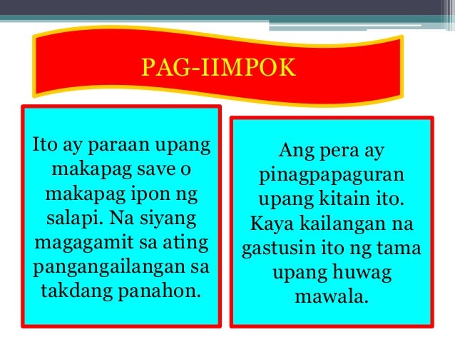 At ipaliwanag kung bakit ang pag-iimpok ay. 1 Mag impok tayo para sa ating pamilya para mabigay natin ang kanilang pangangailangan. Walang kasiguruhan ang buhay kaya nga kailangan paghandaan ang mga hindi inaasahan tulad ng.